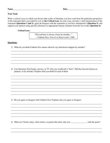 It makes critical lens essays to be an advanced form of analysis, critical lens essay. The ultimate goal of such essays is to provide relevant arguments regarding your position on the quote with the help of several examples from literary sources that support the logic behind your stance. Such assignments generally analyse quotes from famous texts from a particular piece of art or culture, critical lens essay. Analysing non-theoretical pieces is also possible as critical lens essay as a theoretical approach is being adopted.